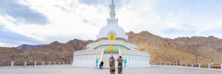 It is a Buddhist white domed stupa in Leh district, Shanti Stupa was built by a Japanese Buddhist monk Gyomyo Nakamura and was enshrined by the 14th Dalai Lama himself. The stupa holds the relics of the Buddha at its base, and provides a panoramic view of the surrounding landscape which is the best during dawn and dusk. The stupa is considered to be a major tourist attraction in Leh; it is located at an altitude of 4,267 meters above sea level and is at a short distance of 5 kilometres by road. One can alternatively reach the stupa by climbing 500 steps from the city of Leh.